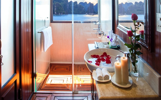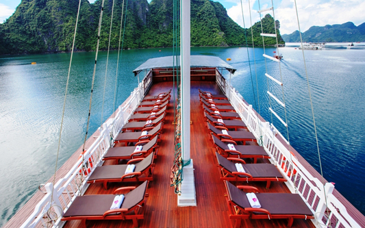4.30 pm: Upon arrival at Soi Sim Island, our guest can continue party on the sundeck or you can bring the party to Soi Sim Beach. For those cant resist plunging into the emerald waters of Halong Bay they can safely do so from the white sandy crescent-shaped beach stretch of the island.